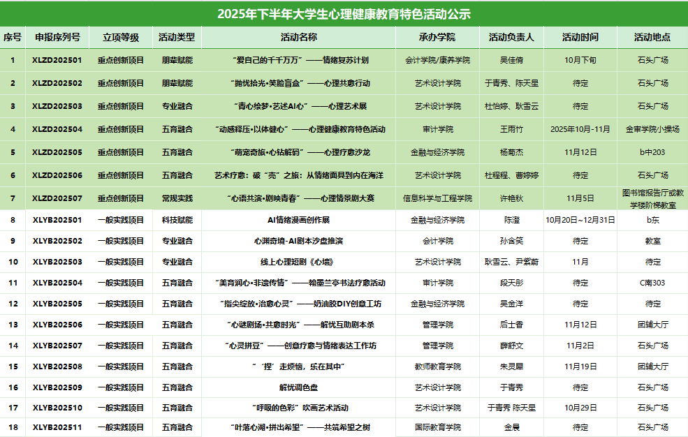 为进一步夯实校园心理健康教育工作基础,多维度提升心理育人实效,着力培养学生自尊自信、理性平和、积极向上的健康心理状态,校心理健康教育与指导中心此前有序组织开展 2025 年下半年大学生心理健康教育特色活动申报工作。经各学院专兼职心理教师、辅导员积极申报,共收到申报项目 31 项。经校心理健康教育与指导中心评审、学生处审核,最终确定 2025 年下半年大学生心理健康教育特色活动立项项目 18 项,其中重点创新项目 7 项、一般实践项目 11 项。现将立项结果予以公示,具体内容如下: