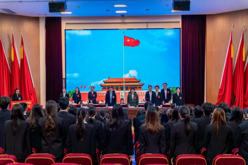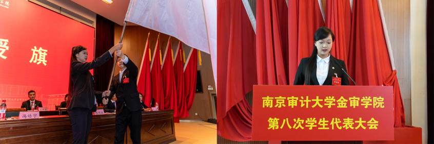 大会秘书长冯皓宇老师将学生会会旗授予第八届学生会主席团代表张艺曦,顺利完成交接;青春之我,砥砺深耕,奋楫争先,为金审学院的高质量发展贡献青春力量!