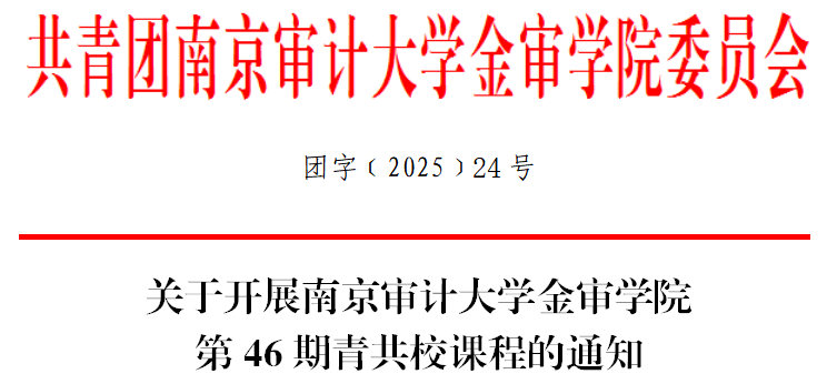 根据《中国共产党发展党员工作细则》《共青团推优入党工作实施办法(试行)》有关文件精神,结合《南京审计大学金审学院发展党员工作细则》(南审金审党〔2025〕20号)要求,决定开展第46期青共校课程,现将有关事项通知如下: