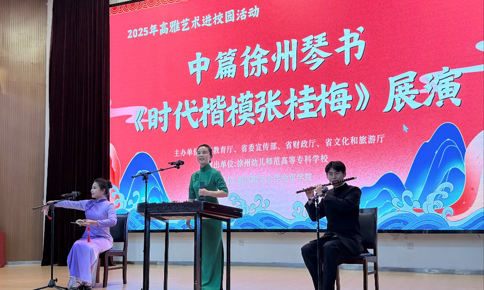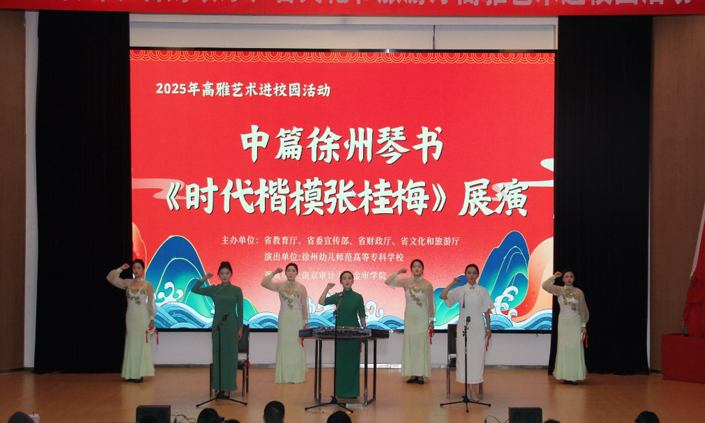 2025年11月16日下午,江苏省高雅艺术进校园活动——原创中篇徐州琴书《时代楷模张桂梅》在南京审计大学金审学院倾情上演。这部以“七一勋章”获得者张桂梅真实事迹为蓝本创作的曲艺作品,凭借其真挚的情感与非遗艺术的独特韵味,为全场师生带来一场感人至深的精神洗礼。