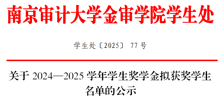 按照《南京审计大学金审学院学生奖学金评定办法》(南审金审学﹝2025﹞50号)文件要求,经学生本人申报、所在学院审核公示、学生处复审,现将2024—2025学年学生奖学金拟2372名获奖学生名单(其中特等奖105人,一等奖245人、二等奖616人、三等奖1406人)进行公示。名单见附件。
