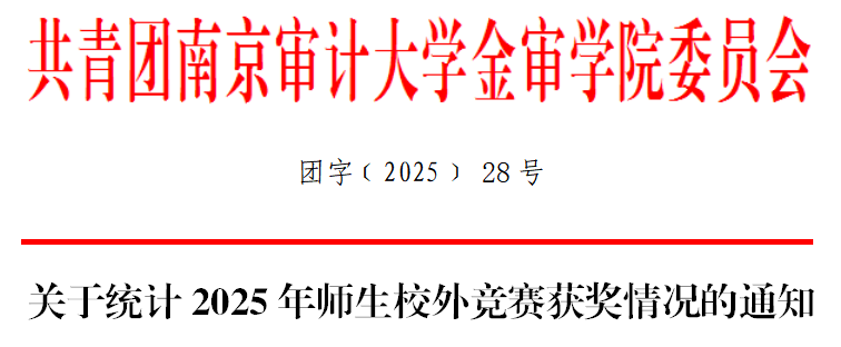 为鼓励师生参加各级各类竞赛,不断提高学生实践创新能力,现统计我校师生参加2025年校外竞赛获奖情况,组织申报学校奖励。各获奖团队、个人、指导教师须依据《南京审计大学金审学院师生参加校外竞赛管理办法》(南审金审团﹝2025﹞30号)(附件1)的相关规定,认真如实填写《2025年大学生校外竞赛获奖情况统计表》(附件5)。二级学院、部于12月19日前将统计表及获奖证书电子版、纸质版提交学校团委冯皓宇老师。