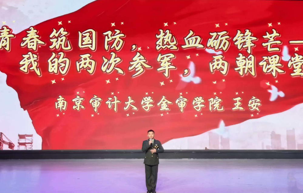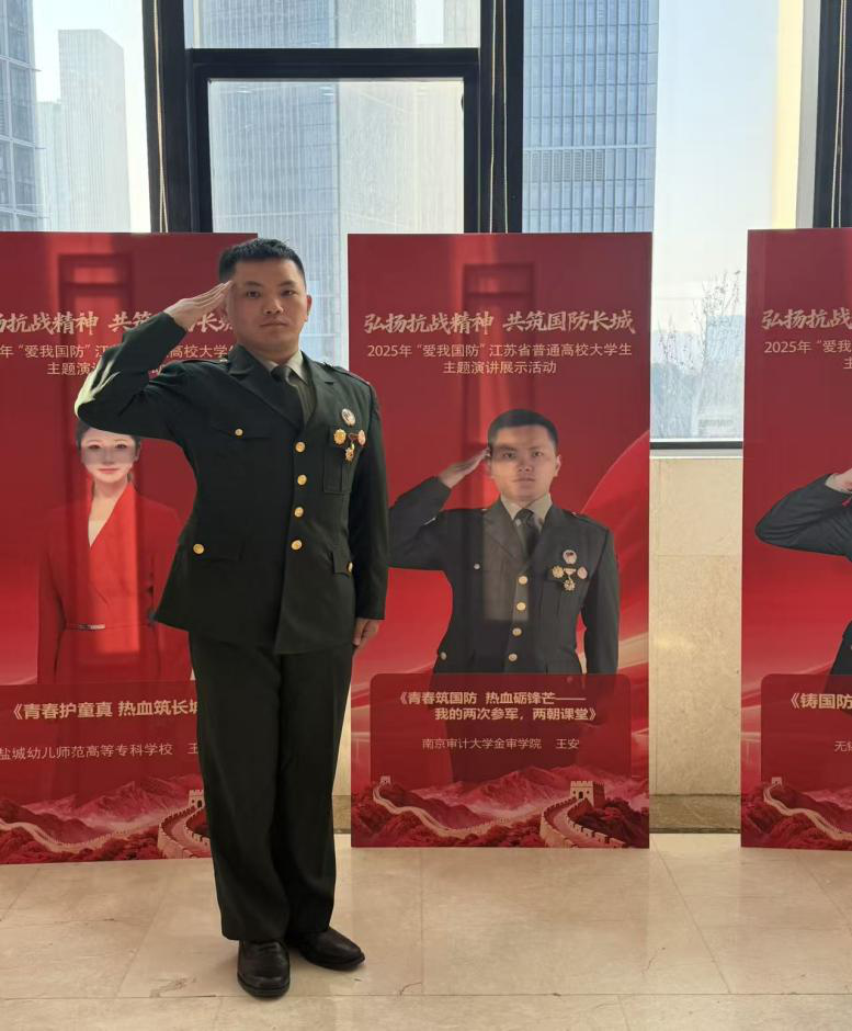 赛后,王安同学在接受新华日报·交汇点新闻记者采访说到:“18岁时北上参军,两年武警生涯让我从懵懂少年成长为坚毅军人。退伍返校后,当看到学弟学妹“强国有我”的誓言,毅然决定再次入伍,奔赴新疆喀喇昆仑。在喀喇昆仑,站在陈祥榕烈士墓碑前,我深受触动,毅然决然将“清澈的爱,只为中国”融入血脉。“两次身份转变、两次重返校园,现在我在南京审计大学金审学院继续攻读王牌专业审计学,磨砺我心态的同时,更是我人生中不可或缺的宝贵经历,希望我的故事能带动更多的青年朋友,把爱国精神传递下去,愿这份爱国的热忱,能化作每个人心中的火种,照亮前行的道路,共同守护这盛世中华。”