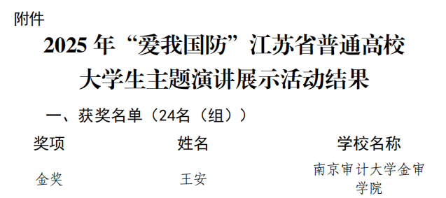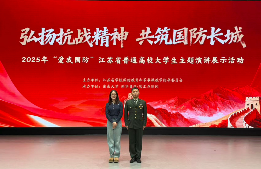 近日,由江苏省学校国防教育和军事课教学指导委员会主办,东南大学、新华日报·交汇点新闻承办的2025年“爱我国防”江苏省普通高校大学生主题演讲展示活动落下帷幕,江苏省共有86所高校参加比赛,南京审计大学金审学院推荐的23级审计7班退役士兵王安凭借作品《青春筑国防,热血砺锋芒——我的两次参军,两朝课堂》以预赛排名第五名进入江苏省总决赛。总决赛知名院校云集,有东南大学、南京航空航天大学、河海大学、江苏师范大学、南京林业大学、中国矿业大学等24所本专科院校,决赛中王安同学发挥出色,代表金审学院以总积分第一名的佳绩荣获金奖,被学习强国、新华日报·交汇点新闻多家媒体采访,展现了“新”金审国防教育“新”成效和卓越学子风采,这也是继2025年12月我校国防教育在江苏省获得二等奖后又一突破!