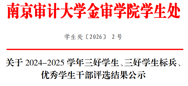 按照《南京审计大学金审学院三好学生、三好学生标兵、优秀学生干部评选办法》文件要求,经学生个人申报、各学院审核公示、学生处复审,现将2024-2025学年三好学生、三好学生标兵、优秀学生干部评选结果进行公示。名单见附件。