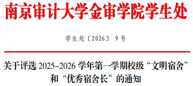 根据《南京审计大学金审学院学生公寓管理规定(试行)》、《南京审计大学金审学院星级宿舍、文明宿舍、优秀宿舍长评选办法(试行)》等文件要求,现开展2025-2026学年第一学期校级“文明宿舍”和“优秀宿舍长”评选。现将有关事项通知如下:
