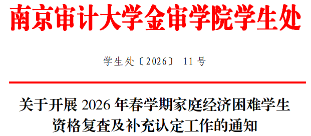 为做好春季学期家庭经济困难学生的资助工作,切实保证国家制定的各项资助政策和措施真正落实到家庭经济困难学生身上,根据《南京审计大学金审学院家庭经济困难学生认定工作实施办法》相关要求,现就我校2025-2026学年春学期家庭经济困难学生资格复查及补充认定工作通知如下。